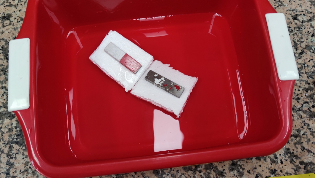 Si se utiliza madera como flotador es fácil que vuelque al poner encima el imán. Una lámina plana de poliestireno funciona mejor. |