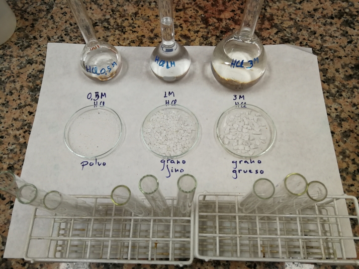 - Trabajar con trocitos de mármol de 1 o 2 mm permite unas velocidades de reacción fácilmente observables en el burbujeo.